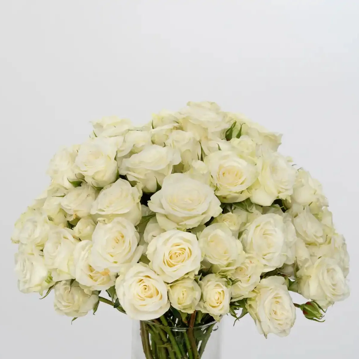 These spray roses with petite blooms are a study of delicate beauty. The understated elegance of the alabaster buds radiates pure sophistication, seamlessly complementing both simple and bold blossoms.